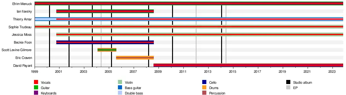 Menuck is often identified as the band's frontman and leader, even though he has repeatedly stated that this is not the case. Though Menuck's voice and lyrics are often prominent on the records, everyone in the band sings on stage, contributing to the harmonies while standing in a semicircle, with members facing each other as often as the audience.
