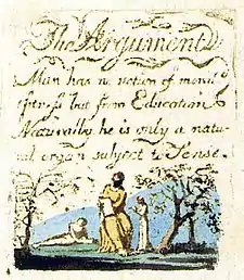 | Plate a3 (Argument) | ![]() | The Argument Man has no notion of moral fitness but from education Naturally he is only a natu- ral organ subject to Sense. | In the main picture, a woman is seated in a chair. Her legs are crossed and she holds a book, from which she appears to be reading. On the right stands a young girl, also holding a book from which she reads. On the left, a young boy is lying on the ground with his torso propped up on his left elbow. He too appears to be reading. Numerous tiny figures can also be seen in the vicinity of the words "The Argument". Furthest on the left, a figure leans against the vertical of the "T" in "The". Moving to the right, another figure, possibly winged, hovers above the space between "The" and "Argument". Next, a figure leans against the left diagonal of the "A". Another figure stands by the right diagonal of the "A" reaching up to the right towards a bird above the "u" and "m." Additionally, the first and last letters of the heading expand out into vines, as does the final "n" in "Education" in the main text.[36] | From Copy G. Three of the six original impressions of this plate are in colour (from Copies C, G and M; although all three differ from one another in their colouration), and three are in monochrome (from Copies A, B and D). The picture is probably a symbolic depiction of the education mentioned in the text. However, even here, Blake introduces a sense of contrariness, as the figures mingled amongst the text "may suggest a source of education more energetic and spiritual than can be provided by the books and vegetation below."[37] |