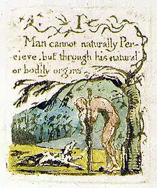 | Plate a4 (I) | ![]() | I Man cannot naturally Per- cieve, but through his natural or bodily organs | An old man, naked, leans on a walking stick and looks down at a dog on the ground, which looks up at him. In the background can be seen a hill and a clump of trees. A tree also grows on the right margin, a branch of which forms a canopy over the old man. Another branch extends to the top of the plate and separates the heading and the first line of text. At the far end of this branch, sits a tiny human figure, with a number of birds flying above him. | From Copy G. Three of the six original impressions of this plate are in colour (from Copies C, G and M; although all three differ from one another in their colouration), and three are in monochrome (from Copies A, B and D). The image is a metaphorical depiction of the text, with the old man perceiving through his bodily organs (his eyes). The dog may carry the symbolic association that Man's organic perceptions are no better or different than animals', i.e. if Man limits himself to his organic senses and adheres to the principals of Empiricism, he is no different, or better, than a mere animal; it is only by the acceptance of the spiritual and the imagination, faculties unavailable to animals and unique to Man, that he can rise above a strictly physical existence.[38] Blake would return to this concept in the planographic print Nebuchadnezzar (c.1795/1805). The posture of the man is based on a centurion in Raphael's Deliverance of Saint Peter (1514).[37] As in the previous plate, with the small figures interacting with the text, "Blake has established an opposition between limited perceptions on the ground below the text and livlier, freer motifs above."[37] |