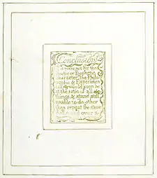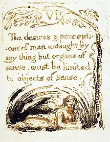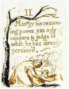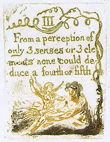 | Plate a6 (III) | ![]() | III From a perception of only 3 senses or 3 ele -ments none could de- -duce a fourth or fifth | A man with a beard sits on the ground, reaching to the left with both arms. A winged putto, visible from the waist up, appears behind the man's legs, and reaches towards the man's shoulder with his left hand. His right hand is pointed upwards. A tree grows on the right margin and branches out both above and below the heading. | From Copy G. The presence of the putto, and his gesture of pointing heavenward may indicate the spiritual perceptions beyond the reach of the "3 senses".[41] However, as Bindman notes, it is significant that the man does not look at or reach towards the putto or the sky. As such, if the putto or what he points at represent spiritual perceptions, the man is ignoring both of them, and concentrating instead on what his organic senses can perceive.[42] |