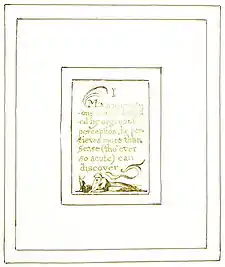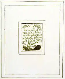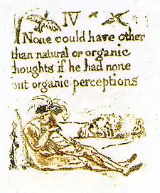 | Plate a7 (IV) | ![]() | IV None could have other than natural or organic thoughts if he had none but organic perceptions | A man sits on the ground with his back against a tree, playing a pipe. He wears a hat decorated with feathers. The landscape on the right features a small hill and a grove of trees. A single tree extends up the left margin. Three birds fly above the text and on each side of the heading. | From Copy G. The image could depict the "organic perceptions" mentioned in the text—the piper is creating his art by means of an organic process.[43] However, although he creates his art via his physical organs, it is a process dependent on imagination, and as such, Bindman believes the birds symbolise the music of the poet, flying upwards into infinite air and thus beyond the organic perceptions which seem to triumph in the previous plate.[42] |