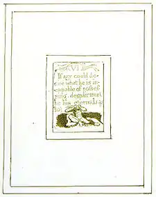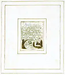 Relief etching was the same basic method used for woodcutting, and copper relief etching had been practised in the early 18th century by Elisha Kirkall, but Blake was the first to use such a method to create both words and designs mixed together on the same plate.[13] Apart from the unique aesthetic effects possible, a major advantage of relief etching was that Blake could print the material himself. Because the text was in relief, the pressure needed for printing was constant, unlike in intaglio printing, where different pressures were needed to force the paper into the furrows, depending on size. Additionally, intaglio etchings and engravings were printed with great pressure, but in relief etching, because the printed material was a raised surface rather than incised lines, considerably less pressure was required.[14] As such, relief etching tackled the problem of the division of labour of publishing. Blake's new method was autographic; "it permitted—indeed promoted—a seamless relationship between conception and execution rather than the usual divisions between invention and production embedded in 18th-century print technology, and its economic and social distinctions among authors, printers, artists and engravers. Like drawings and manuscripts, Blake's relief etchings were created by the direct and positive action of the author/artist's hand without intervening processes".[15] Blake served as artist, engraver, printer and publisher.