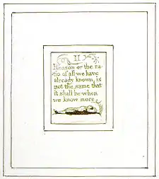 | Plate b12 (Therefore) | ![]() | Therefore God becomes as we are, that we may be as he is | Below the text, a man lies on a bed, facing outwards towards the reader. He seems to have lines of radiance emanating from his head. Several vines decorate the spaces all around the heading ("Therefore"). Another vine descends down the right margin near the third and fourth lines of text. On the left, the last letter of "may" extends into a small vine. Vines also surround the final word on the plate, "is", which is on a line on its own. | From Copy G. Although there is no way of knowing if the man is living or dead, the motif of the beams of radiance suggest he may be Christ, and thus the "God" who "becomes as/we are, that we/may be as he/is."[47][48] S. Foster Damon interprets this image as depicting an Incarnation, and the text as echoing the words of Athanasius; "He indeed assumed humanity that we might become God" (The Incarnation of the Word of God, 54). However "where the theologians all use the past tense, as of a historical event, Blake uses the present tense, for the act is eternal and is always going on."[49] Robert N. Essick believes the design perfectly reflects the text; "the Word (Blake's text) becomes the flesh (branches, leaves, etc); the flesh becomes the Word."[50] |