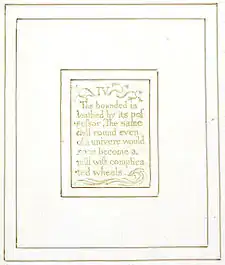 | Plate b6 (IV) | ![]() | IV The bounded is loathed by its pos- -sessor, The same dull round even of a univere would soon become a mill with complica- -ted wheels. | At the top of the plate, a vine fills the space above the text and to both the left and the right of the heading. A vine also runs along the bottom of the plate. | From Copy L. The only plate in Blake's two series' in which there is no image of any kind, other than the vines at the top and bottom. However, the energetic vegetation could be interpreted as symbolising an escape from the "dull round" of empiricism.[46] |