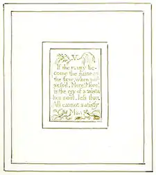 | Plate b7 (V) | ![]() | V If the many be- -come the same as the few, when pos- -sess'd, More! More! is the cry of a mista ken soul, less than All cannot satisfy Man | At the top of the plate, vines fill the spaces to both the left and the right of the heading. At the bottom of the plate, to both the left and right of the last word, "Man", which is on a line on its own, hover two small figures, each of which seem to be praying. Vines grow around both figures. | From Copy L. The two figures serve to complement the energetic vegetation introduced in the last plate. Whereas there, only vegetation was depicted as inherently energetic, here, the form of Man is introduced, as he also begins to reject empiricism.[46] |