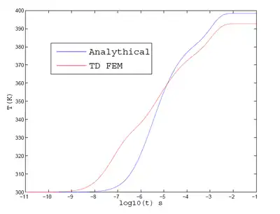 The next figure shows a comparison of the peak temperature as a function of time for both methods. The system reaches steady state in approximately .
