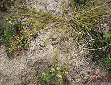 Thesium humifusum is a hemiparasitic plant that steals nutrients from hedge bedstraw (Galium album) or lady's bedstraw (Galium verum).[4] Although it can be abundant in appropriate habitats, its low growth habit and inconspicuous flowers mean that it is often overlooked.[7] In Great Britain, it is restricted to downlands over chalk or oolitic limestone in southern England.[9] Elsewhere, it may also grow in sand dune systems.[4]