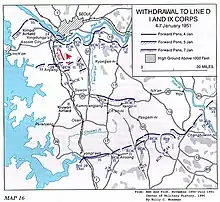 By December 22, 1950, the US Eighth Army's front had stabilized along the 38th Parallel.[34] Just days before his death, Walker placed US I Corps, US IX Corps, and ROK III Corps of the Eighth Army along the 38th Parallel to defend Seoul.[34] US I and IX Corps were to defend the Imjin and Hantan River respectively,[34] while ROK III Corps were to guard the areas around Chuncheon.[34] The boundary between US I and IX Corps was marked by Route 33, and was defended by the ROK 1st Infantry Division on the west side and the ROK 6th Infantry Division on the east side.[35]
