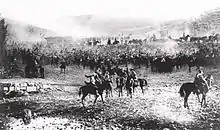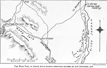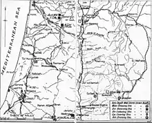 The Mafid Jozel ford was captured by the 2nd Battalion British West Indies Regiment, reinforced by the 3rd Light Horse Regiment, 1st Light Horse Brigade. Despite encountering strong resistance at Mellahet umm Afein, this force attacked and "drove in" the rearguard defending the ford and an Ottoman column withdrawing across the ford. Mafid Jozele was captured by 05:50 on 23 September, along with 37 prisoners, but the bridge had been destroyed at the ford.[64][65] The last remaining Ottoman defences on the western bank of the Jordan south of the Jisr ed Damieh bridge had thus been captured, although most of the Ottoman defenders of these two fords managed to escape.[63] Captures included 105 prisoners, 4 machine guns, 4 automatic rifles, transport, horses and stores.[64]