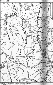 Chaytor's Force held the right flank from their junction with the XX Corps in the Judean Hills 8 miles (13 km) north west of Jericho, across the Jordan Valley, and then southwards through the Ghoraniye and Auja bridgeheads to the Dead Sea.[9] This area was overlooked by well sited Ottoman or German long range guns and an observation post on El Haud.[10][11]
