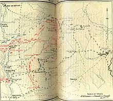 The Ottoman front line had been strengthened after the Second Transjordan attack. It began in the south, where Ottoman cavalry guarded tracks to Madaba before continuing with strongly wired entrenchments. In front of these, advanced posts extended from the foothills opposite the ford across the Jordan River at Makhadet Hijla to about 4 miles (6.4 km) north of the Jericho to Es Salt road. The road had been cut at the Ghorianyeh Bridge before the First Transjordan attack, in the vicinity of Shunet Nimrin. The front line was strengthened by advanced posts which were also wired on the left flank at Qabr Said, Kh. el Kufrein and Qabr Mujahid. From their right flank in the foothills a wired line of redoubts and trenches facing south ran from 8,000 yards (7,300 m) north of Shunet Nimrin, across the Jordan Valley to the Jordan River, 1,000 yards (910 m) south of the Umm esh Shert ford.[12][13][14] This line was continued west of the river by a series of individual "wired-in redoubts with good fields of fire,"[15] then as a series of trenches and redoubts along the northern or left bank of the Wadi Mellaha. These were followed by a "series of trenches and redoubts towards Bakr Ridge which were entrenched but not wired. A strong advanced position of well built sangars and [sic] [which were] wired in was held at Baghalat."[13] Bakr Ridge in the Judean Hills was situated to the west of the salient at El Musallabe which was held by the EEF. The Ottoman front line was supported by entrenched positions on Red Hill beside the Jordan River, which was also the site of their main artillery observation point.[12][13][14]