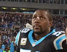 On June 15, 2015, Davis signed a two-year contract extension.[65] In 2015, Davis changed the back of his jersey from "Davis" to "Davis Sr" at the request of his son.[66] Davis continued his outstanding play during the start of the 2015 NFL season, recording 25 tackles, 1 interception, and 1 forced fumble through just the first three games. The next week against the Tampa Bay Buccaneers Davis recorded 11 tackles and 1 interception in a 37–23 victory. Davis played very well during the Panthers Sunday Night victory over the Philadelphia Eagles recording a season high 13 tackles. Through the first 15 weeks of the 2015 NFL season, Davis set career highs in sacks (5.5) and interceptions (3). For his efforts, Davis was named to the 2016 Pro Bowl, a rare honor to an outside linebacker in a 4-3 defense.[67][68] Davis finished the regular season with 105 total tackles, 5.5 sacks, and 4 interceptions. He was named to the AP All-Pro First Team.[69] During the Divisional Round Playoffs, another showdown against Seattle, Davis secured the Panthers win by catching the Seahawks onside kick attempt with 1:12 left in the game, sending the Panthers into the NFC Championship Game.[70] It was Davis' second onside kick recovery of the season, the first coming against the Dallas Cowboys Thanksgiving night game.[71] Davis returned to the NFC Championship game for the first time since his rookie season in 2005, the only active Panther to have played in both conference championship games.[72] Davis was knocked out of the conference win in the second quarter with a broken arm, and finished the game with six tackles. He vowed to return for the Super Bowl and went into surgery early the following morning on the arm to uphold that promise.[73] Davis played in Super Bowl 50. In the game, he recorded seven tackles, but the Panthers fell to the Denver Broncos by a score of 24–10.[74][75] According to Pro Football Focus, Davis had the second-highest coverage grade of any linebacker in the NFL behind only teammate, Luke Kuechly.[76] He was ranked 54th on the NFL Top 100 Players of 2016.[77]