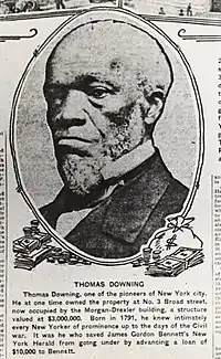 Thomas Downing (1791-1866) was an American restaurateur and abolitionist active in New York City during the Victorian era who was nicknamed the "New York Oyster King". He was one of the wealthiest people in New York City at the time of his death, though he spent his life being prohibited from acquiring U.S. citizenship until the Civil Rights Act of 1866 was passed, the day before he died.[1]