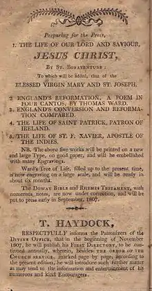The 1806 Divine Office cited above carries the following announcement of what would become Haydock's most important work: The Doway Bible and Rhemes Testament, with numerous notes, are now under correction, and will be put to press early in September, 1807.