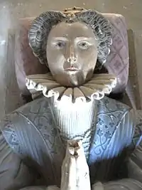 - Frances Kitson, who married firstly on 11 December 1548[20] her step-brother John Bourchier, Lord FitzWarin (who predeceased his father), eldest son of John Bourchier, 2nd Earl of Bath, by whom she had a son, William Bourchier, 3rd Earl of Bath, and secondly she married William Barnaby of Great Saxham, Suffolk.[16] Her monument with recumbent effigy exists in the south chancel aisle built by her father-in-law and step-father[21][lower-alpha 1] in Tawstock Church, Devon, next to the Bourchier seat of Tawstock Court, and is covered by the earliest six-columned canopy in Devon.[22]