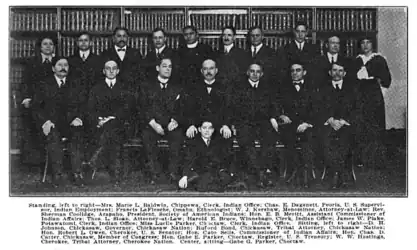Sloan was one of the founding members of the Society of American Indians.[1] He served as a member of its executive council and was its first vice president.[8] Later, however, Sloan stepped down from his position as vice president in part due to some rumors about his past.[11] Sloan was eventually named president of the organization, winning over Charles Eastman and Captain Raymond Bonin for the seat.[3] Sloan was the Editor-in-chief of American Indian Magazine, and he supervised other well-known editors such as Clark Wissler, Frederick W. Hodge, and others.[3][8] During WWI and after, Sloan and the other editors used the journal to advocate for Native American law reform and citizenship, similar to the ideas he had shared in the previously mentioned "Talks and Thoughts".[5] In addition, they also worked alongside African American Peers like W.E.B DuBois in debates about racial uplift. Although Sloan and the other editors had high expectations for the journal, it would publish its last issue in August 1920.[13][11]