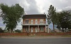 Thomas Leavitt built a two-story brick home in Bunkerville for his first wife Louella (Abbott). Then Leavitt subsequently married a second wife Ada (Waite).[5] The prosperous Leavitt, who had thrived growing grain, raising cattle and selling molasses, built another home for the family. The T-shaped house, two stories high and one room deep, had chimneys at each end. The design was typical of the homes of Mormon settlers dispersing from Salt Lake northward to Idaho and southward towards Nevada. The house featured multiple exterior doors, which in a Mormon polygamist community meant that the house would allow circulation while allowing some interior privacy. The house had no hallways, and was surrounded by large wooden porches on the exterior.