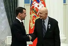 Stafford's military decorations and awards include: the Air Force Distinguished Service Medal with two oak leaf clusters, Distinguished Flying Cross with oak leaf cluster, Air Force Commendation Medal and Air Force Outstanding Unit Award ribbon with three oak leaf clusters. Other awards presented to Stafford include: NASA Distinguished Service Medal with oak leaf cluster, NASA Exceptional Service Medal with oak leaf cluster,[16] the American Institute of Aeronautics and Astronautics Octave Chanute Award (1976), the Veterans of Foreign Wars National Space Award, the Golden Plate Award of the American Academy of Achievement (1976),[17] the National Geographic Society's General Thomas D. White USAF Space Trophy (1975),[18] and the A. B. Honts Award as the outstanding graduate from the USAF Experimental Test Pilot School.[1][4] He was awarded the Gold Space Medal from the Fédération Aéronautique Internationale (FAI) in 1976. FAI created an exception that allowed Leonov to be awarded it alongside him; typically the award is restricted to one person per year.[19]