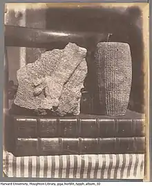 In 1850, at a meeting of the Cambrian Archaeological society (Cymdeithas Hynafiaethau Cymru), Phillips announced that he was seeking to locate his large collection at a location in Wales. He employed a distant relative by marriage, Amelia Elizabeth Guppy, to photograph some of his collection in 1853 including artefacts from Babylon and Utrecht.[12]