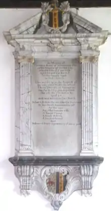 He died on 9 January 1747/48, aged 68.[6] "A stone of eight ounces and one dram was found in his kidneys".[7] His mural monument survives in Broadhembury Church, Devon, erected by his daughter Mrs Drewe. It displays at top the canting arms of Rose: Sable, on a pale or three roses gules slipt and leaved proper; Crest at top: A rose slipped and leaved; bottom: Drewe (Ermine, a lion passant gules) impaling Rose. It is inscribed as follows: