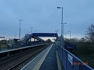 There is one Ticket Machine (Machine only takes Card Payment). A dedicated, partially-surfaced area has recently been provided adjacent to the north side of the station offering a small amount of free car parking for rail users. Train running information is provided by timetable poster boards and Departure Boards on Both Platforms & at entrance to Station. Audio Announcements are provide on both Platforms. A fully accessible ramped footbridge links the two platforms - this was opened in July 2013 by Network Rail to replace the old barrow crossing, which had been the scene of several "near misses" prior to a passenger being injured by a passing train whilst trying to cross the line in January 2013. The temporary structure erected immediately after the accident was then replaced by the current accessible bridge whilst the line was closed for repairs following the spoil tip collapse at Hatfield Colliery.[4]