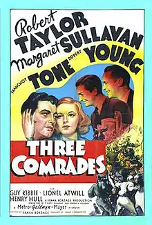Three Comrades is a 1938 American drama film directed by Frank Borzage and produced by Joseph L. Mankiewicz for MGM. The screenplay is by F. Scott Fitzgerald and Edward E. Paramore Jr., and was adapted from the novel Three Comrades by Erich Maria Remarque. It tells the story of the friendship of three young German soldiers following World War I, during the Weimar Republic and the rise of Nazism.