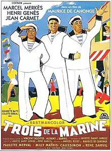 Three Sailors (French: Trois de la marine) is a 1957 French comedy film directed by Maurice de Canonge and starring Marcel Merkès, Henri Génès and Jeannette Batti.[1] The film was made at the Victorine Studios in Nice with sets designed by the art director Claude Bouxin. It was shot in Eastmancolor.