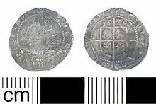 The English three halfpence, a silver coin worth 1+1⁄2d, was introduced in Elizabeth I's third and fourth coinages (1561–1582) as part of a plan to produce large quantities of coins of varying denominations and high silver content. The obverse shows a left-facing bust of the queen, with a rose behind her, with the legend E D G ROSA SINE SPINA – Elizabeth by the grace of God a rose without a thorn – while the reverse shows the royal arms with the date above the arms and a mintmark at the beginning of the legend CIVITAS LONDON – City of London, the Tower Mint.