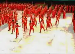 The CPDRC inmates have performed numerous other songs, including Queen's "Radio Ga Ga" and several songs from Sister Act, with prisoners dressing as nuns in habits.[2][3] 44 female inmates, held in a separate wing from the males, joined the men in a dance to "I Will Follow Him".[1] "Hail Holy Queen", from Sister Act 2, and the Algorithm March were also performed by the convicts and then upload onto YouTube.[8] The inmates dance in order to help pass the time while serving their prison sentences or awaiting a trial. More than 900 of the inmates take part in the routines, with a small group of dancers at the core of each performance. Every prisoner at CPDRC, apart from the old and the infirm, has a part in the routine. Garcia directs and choreographs each of the dances.[2][6] The inmates' participation is said to be completely voluntary, with no prisoner being forced to dance. "It would be different if they are being forced to dance", declared Rubio. "I've never known any prisoners being forced to dance. It's normal to dance."[2] The inmates have express pride at their performing success, and routinely query the viewing figures for their routines.[6] By August 2007, ten of the prisoners' performances had been viewed over 100,000 times each.[15] In 2007, the prisoners stated that they were to perform to Vanilla Ice's "Ice Ice Baby".[4][6] At the time, they were also practicing Philip Oakey and Giorgio Moroder's "Together in Electric Dreams", a homage to the inmates' fans.[1]
