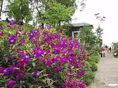 Growing to 3–6 m (10–20 ft) tall by 2–3 m (7–10 ft) wide, it is a sprawling evergreen shrub with longitudinally veined, dark green hairy leaves. Clusters of brilliant purple flowers up to 10 cm (4 in) in diameter, with black stamens, are borne throughout summer and autumn.[5]