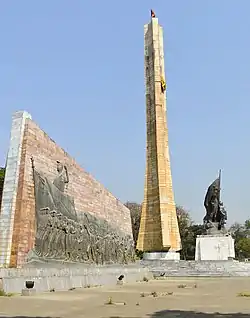 The Tiglachin Monument (Amharic: ትግላችን ሐውልት, lit.'Our Struggle Monument'), also known as the Derg Monument (Amharic: ደርግ ሐውልት), is a memorial to Ethiopian and Cuban soldiers involved in the Ogaden War. It was built during the rule of Mengistu Haile Mariam and is located on Churchill Avenue in Addis Ababa, Ethiopia. The monument is composed of various elements: a central statue, a 50 m tall pillar, two wall reliefs on the sides and two squares where the portraits of Cuban soldiers are visible.[1] Some sculptures at the monument was given by the North Korean government in 1984, and was one of the project’s first monuments to be donated to Africa.[2]