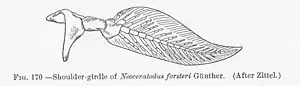 The "fins" of Tiktaalik have helped to contextualize the origin of weight-bearing limbs and digits. The fin has both a robust internal skeleton, like tetrapods, surrounded by a web of simple bony fin rays (lepidotrichia), like fish.[1] The lepidotrichia are thickest and most extensive on the front edge and upper side of the fin, leaving more room for muscle and skin on the underside of the fin.[2] The pectoral fin was clearly weight bearing, being attached to a massive shoulder girdle with expanded scapular and coracoid elements attached to the body armor. Moreover, there are large muscle scars on the underside of the forefin bones, and the distal joints of the wrist are highly mobile. Together, these suggest that the fin was both muscular and had the ability to flex like a wrist joint. These wrist-like features would have helped anchor the creature to the bottom in a fast current.[6][5]
