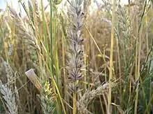 Agropyron (wheatgrass), Bromus (bromegrasses), Elymus (wildrye), Festuca (fescues), Hordeum (barleys), Lolium (ryegrasses), Poa (meadow grass), Secale cereale (rye), Triticale, Triticum spp. (wheats) – including T. aestivum (common wheat), T. dicoccum (hulled wheat), T. turgidum (durum wheat) – and other Poaceae (other grasses).[4]