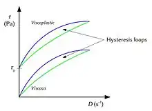 Blue: With increasing shear rate the system is breaking down Green: With decreasing shear rate the system is building up