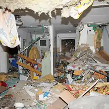 Throughout the night, Israel continued their targeted attacks on Gaza, hitting several sites, resulting in 14 additional deaths, including some women and children.[117] Overnight in the Northern Gaza Strip, 111 airstrikes, involving 120 missiles, struck 15 houses and other targets, with 9 deaths and 51 wounded. In Gaza City, 46 airstrikes, using 54 missiles, hit 14 houses, 2 security sites and a press vehicle, resulting in 10 fatalities and 70 injured. In the Central Gaza Strip, 30 airstrikes, with 33 missiles, demolished 9 houses and struck police stations, resulting in 7 fatalities and 25 wounded. In Khan Yunis, 57 airstrikes demolished 12 houses and a beach resort killing 19 civilians.[118] Israel vowed to intensify the attacks as the operation enters its third day.[119] Eight of those killed were members of the Kaware family. Israel announced that although the family was warned, and they did leave the house, they returned after the warning shot hit the house. They returned home moments after the second rocket was fired and it was too late to reprogram.[120] In total 320 sites in Gaza were hit overnight.[121]