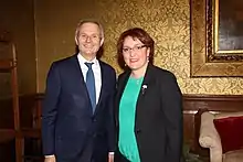 Tinatin "Tina" Khidasheli[1] (Georgian: თინათინ (თინა) ხიდაშელი; born 8 June 1973) is a Georgian jurist and politician. A Republican Party member and former civil society activist, she was appointed as Georgia's Minister of Defense on 1 May 2015, becoming the country's first ever female defense minister. She resigned on 1 August 2016, after her party decided to leave the ruling Georgian Dream coalition.[2]