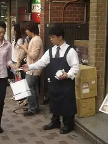 The concept of tissue-pack marketing was first developed in Japan. Its origins date back to the late 1960s when Hiroshi Mori, founder of a paper-goods manufacturer Meisei Industrial Co., was looking for ways to expand demand for paper products. At the time, the most common promotional item in Japan was matchboxes. These were often given away at banks and then used by women in the kitchen.[1] However, the usefulness of matches waned with the rise of gas stoves and disposable lighters.[2] Mori believed that tissues would have even wider appeal than the matches, and as a result he developed the machinery to fold and package tissues into easy-to-carry, pocket-size packs. The new product was marketed only as a form of advertising and was not sold to consumers. By the mid-2000s, it was estimated that four billion free packets of tissues were distributed in Japan with sales in the range of ¥75 billion annually.[1] However, the practice began to slow considerably only a few years later. By 2010, Meisei's own production of the packets had decreased by more than half compared to six years prior and promotions company Cerebrix reduced their tissue distribution by half compared to 2008. Consumers having other similar products on hand as well as companies cutting back on advertising spending were cited as reasons for decline in tissue-pack marketing. Other free seasonal promotional giveaways such as uchiwa fans, wet wipes, cellphone screen wipes, and cloth face masks furthered the decline of the tissue's usage as a promotional item.[2]