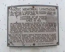 In July 1968 the Seamen's Church Institute moved to 15 State Street. That year, the Titanic Memorial Lighthouse was donated by the Kaiser-Nelson Steel & Salvage Corporation to the South Street Seaport Museum. It was erected at the entrance to the museum complex, on the corner of Fulton and Pearl streets, in May 1976, with funds provided by the Exxon Corporation.[3]