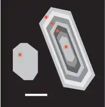 Simplified diagram version of unzoned (left) and zoned (right) zircons. Red dots represent ion microprobe scan locations. White bar is about 50 μm.