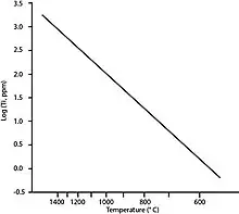 Plot of Ti abundance (log of Ti ppm) versus Temperature in Celsius. Simplified version, modified from Watson and Harrison 2005.