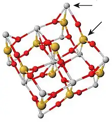 A unit cell of zircon. Arrows point to the possible substitution locations for titanium atoms. Yellow spheres represent silicon atoms, grey spheres represent zirconium atoms.