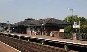 The main entrance and a large car park are on the west side of the station, where a single-storey brick building at platform level incorporates a ticket office and a shop selling newspapers, drinks and snacks. This is the platform for trains towards London Paddington, Bristol Temple Meads and the north.