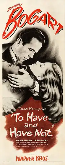 The critical reception of To Have and Have Not at the time of release was mixed and often unflattering. Early publicity and much of the initial reaction focused on Lauren Bacall, either praising her or criticizing her part as merely a gimmick for attention from the press. Some also faulted the film's unfaithfulness to Hemingway, as only the first fifteen minutes resemble his novel. Further, Americans preoccupied with World War II may have had little interest in a hero (Morgan) who consistently rejects commitment and whose only interest in France's cause is financial, to help himself and his girl (Marie).[59] Overall, critics called the film a fast, witty romance whose plot was merely "an excuse for some good scenes".[60] Variety cited its inferiority to Casablanca and other Warner Bros. melodramas, but acknowledged the new film's success in its characterization.[61] Others even considered it a Casablanca remake; Time called it a "tinny romantic melodrama which millions of cinemaddicts have been waiting for ever since Casablanca."[60] New York Variety was more mixed, citing "nifty productional accoutrements" but "too unsteady" a story line.[60] The American film critic James Agee liked the film but felt Going My Way was better, because To Have and Have Not focused too much on "character and atmosphere" rather than on plot.[62] He was far more interested in Bacall's performance than the anti-Fascist themes in the film.[63]
