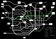 On maps and signboards, the line is shown in the color leaf green. Stations carry the letter "S" followed by a two-digit number inside a yellow-green chartreuse circle.