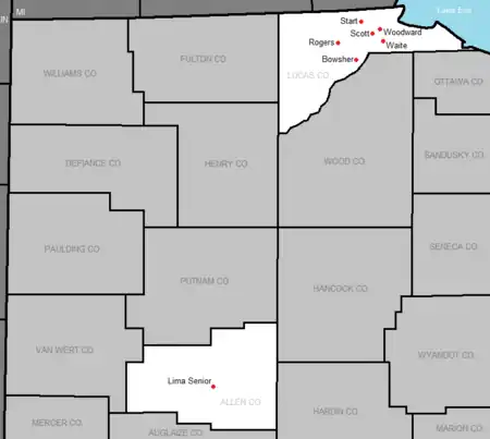 The current member schools of the City League are in red (Lima Senior is not shown). The former members that have been closed are in blue and former members that are in other leagues are in green.