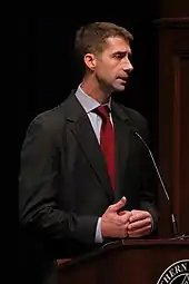 On August 6, 2013, Cotton announced he would challenge Democratic incumbent Mark Pryor for his seat in the United States Senate.[47] Stuart Rothenberg of Roll Call called Pryor the most vulnerable senator seeking reelection that year.[48] Cotton was endorsed by the conservative Club for Growth PAC,[49][50][51] Senator Marco Rubio,[52] the National Federation of Independent Business,[53] and former presidential candidate Mitt Romney, who campaigned for Cotton.[54][55] The Associated Press called the race for Cotton immediately after the polls closed;[56] he received 56.5% of the vote to Pryor's 39.4%.[57] Cotton was sworn into office on January 6, 2015.[58]