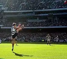 Described as returning to being a "genuine match winner" during the 2014 season by teammate Tom Lonergan, Hawkins overcame his back injury to replicate his form from the 2012 season.[44] He kicked sixty-eight goals for the season including a career-high seven goals against the Brisbane Lions in round 23.[45] He had strong performances against Hawthorn, kicking five goals and North Melbourne, kicking four goals in rounds five and ten respectively;[46][47] his performance against Hawthorn earned him the maximum three Brownlow votes making him the best player on the ground adjudged by the field umpires.[48] During the qualifying final match against Hawthorn, he was scrutinised for a jumper punch against Ben Stratton, which was pondered whether Hawkins would face a suspension;[49] he was ultimately cleared of the incident, which allowed him to play in the semi-final loss against North Melbourne.[50] His season was rewarded with selection in the initial forty man All-Australian squad, although he missed out on the final team.[51] In addition, he finished second in the best and fairest count behind Joel Selwood, he finished second in the Coleman Medal[52] and he was Geelong's leading goalkicker for the third consecutive season.[43]