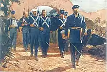 ![]() General John A. Quitman and a Battalion of Marines Entering Mexico City, 1847, a painting by Tom Lovell | |