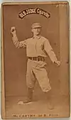 McCarthy was born on July 24, 1863, in Boston, Massachusetts, the eldest son of seven surviving children to Daniel and Sarah McCarthy nee Healy.[1] Daniel McCarthy was born in County Kerry, Ireland. After graduating from South Boston's John A. Andrew Grammar School, McCarthy worked for a clothing company during the day and played baseball at night. In 1884 he went to work for a piano company, where he received $18 a week for work in their factory and play for the company baseball team.[2] Later that year, McCarthy joined the Boston Reds in the Union Association as a starting pitcher and outfielder. In limited innings and at-bats, he played poorly, batting at a paltry .215 average, and lost all seven of his pitching appearances. McCarthy moved to the National League and played with the Boston Beaneaters the following season and the Philadelphia Quakers the following two years but failed to bat higher than .200 in any season, although in limited at-bats.