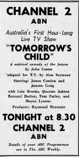 Tomorrow's Child is an Australian television film, or rather a live one-off television play, which aired in 1957 on ABC. Directed by Raymond Menmuir, it is notable as an early example of Australian television comedy and was Australia's first live hour long drama.[3][4][5][6]